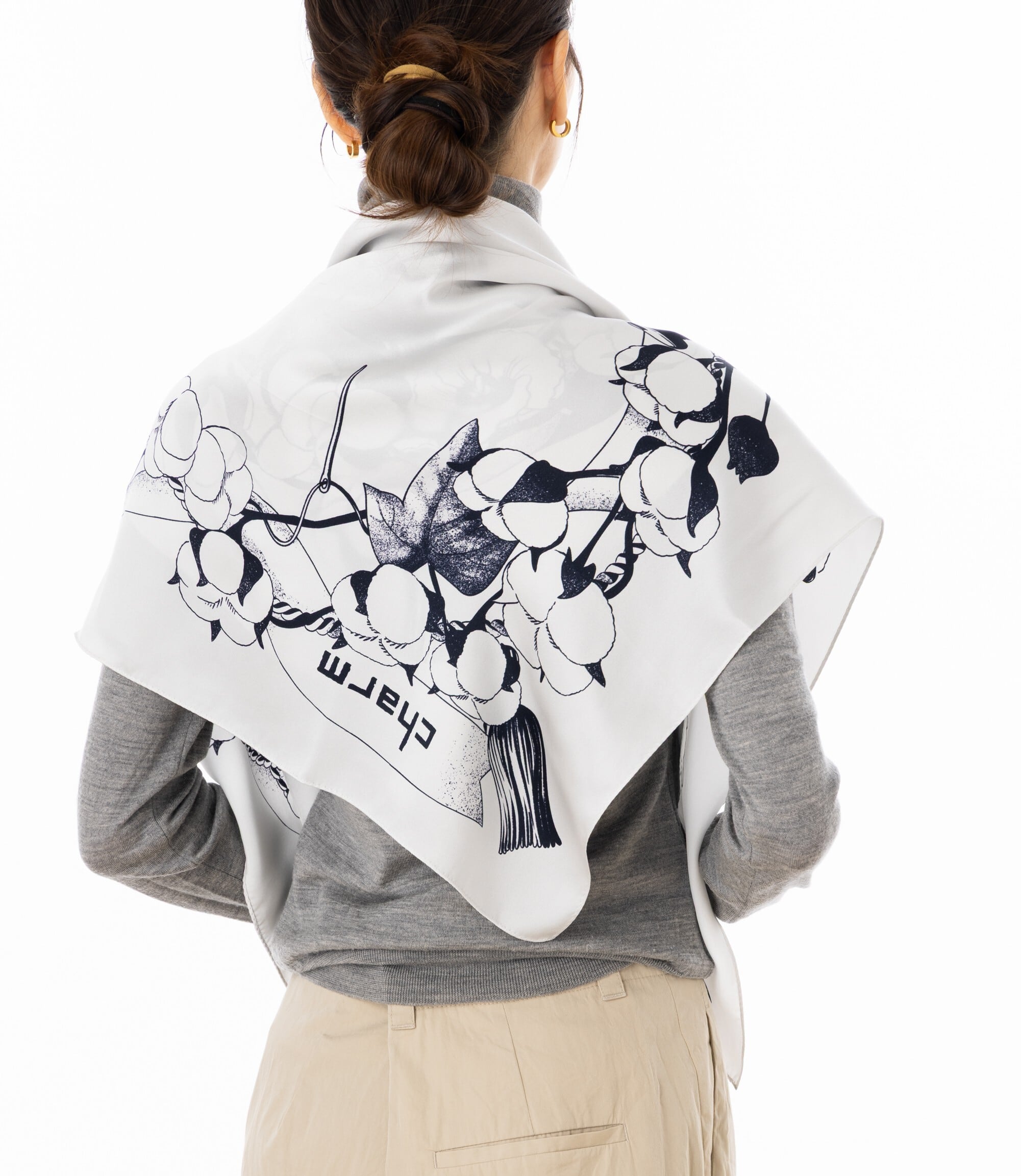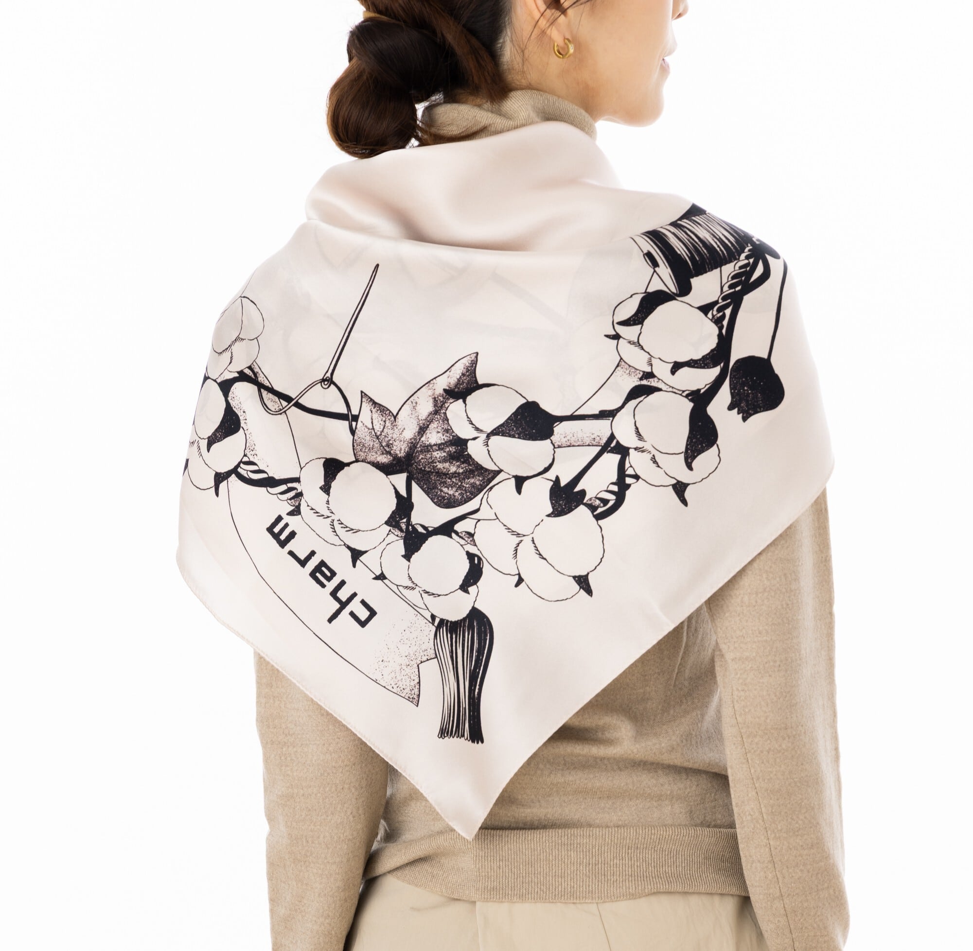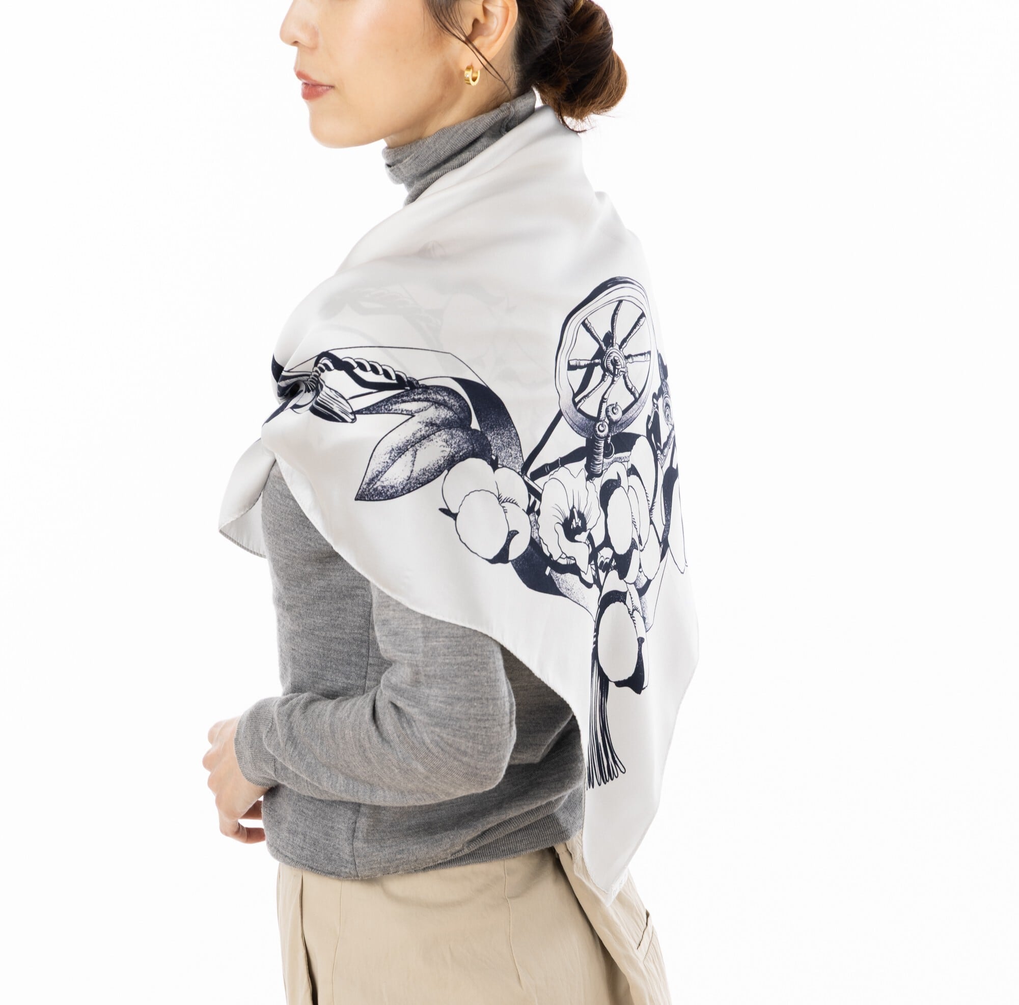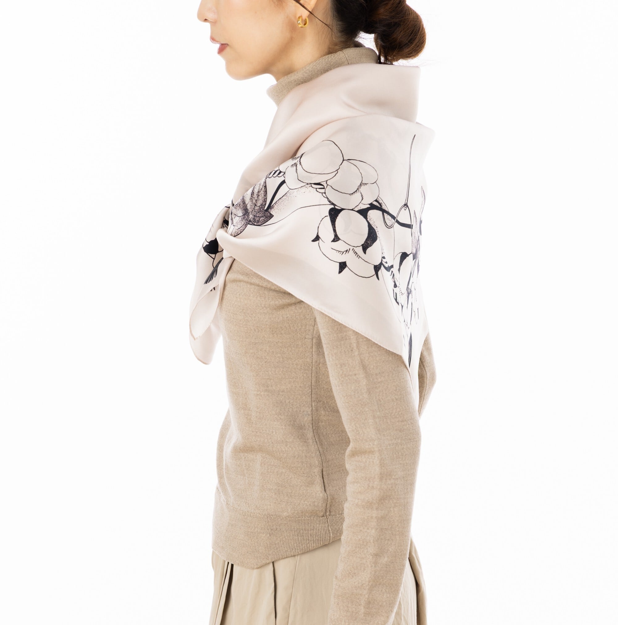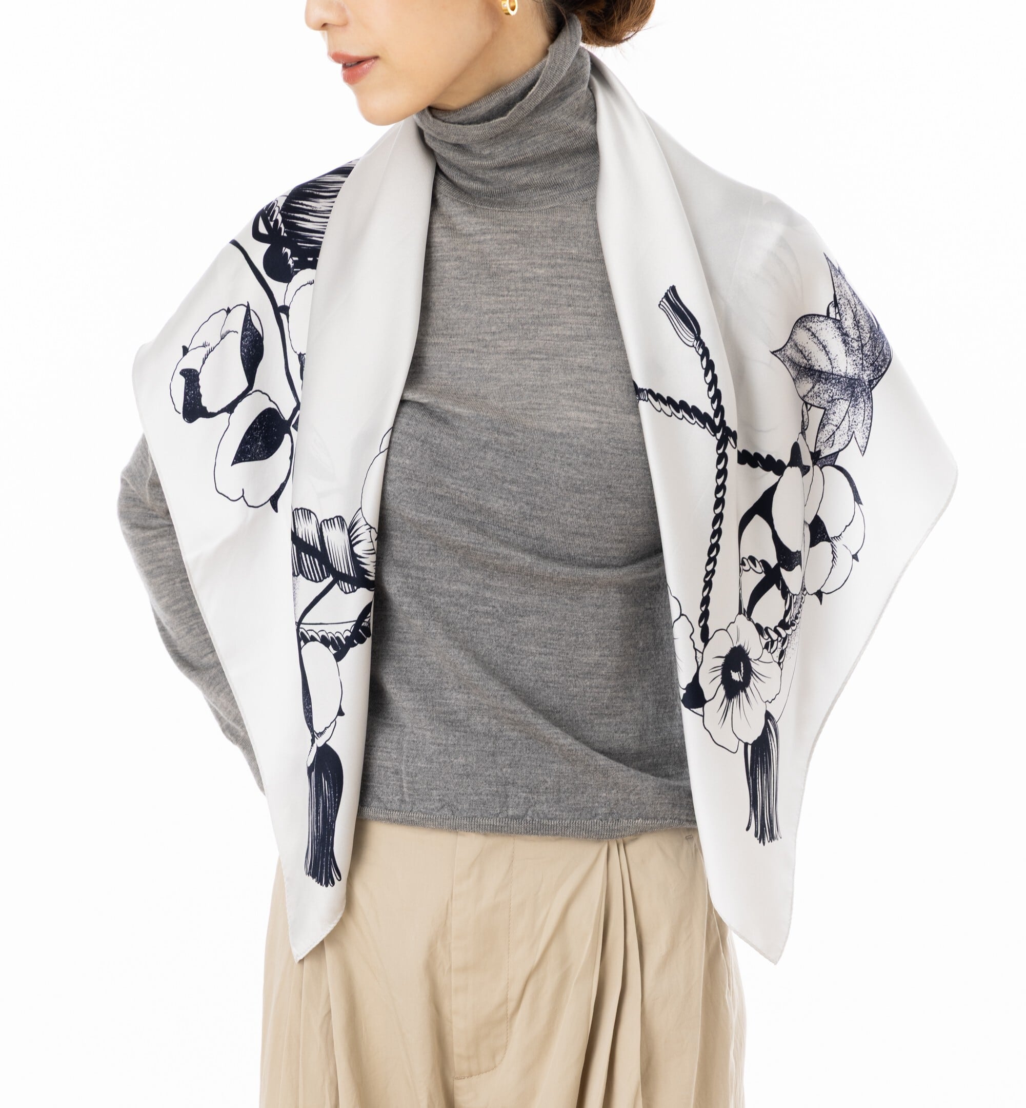 シルクサテンの88㎝角の大判スカーフなので、様々なアレンジが楽しめます。